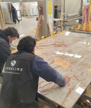During the slab cutting process, each slab is checked both visually and physically. Then patterns and surface texture are identified. After slab dimensions are taken, photos are taken. In case there is a fault, slabs are reprocessed. Those slabs that pass quality control with approval are dispatched to our Istanbul Ayazaga or İzmir Export Showrooms.