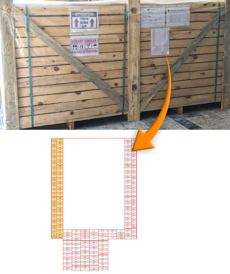 Case labeling: We attach labels that show the selection of the case. The stones that have been grouped and/or numbered during dry lay at the factory are packaged separately. We attach content information, marked layout and photos taken during dry lay on the packaging. While this process is quite difficult to be organized on site, all these preparations at the factory allows an easy assembly process eliminating loss of time during assembly and installation.