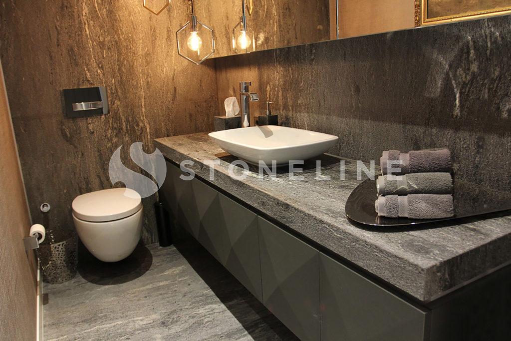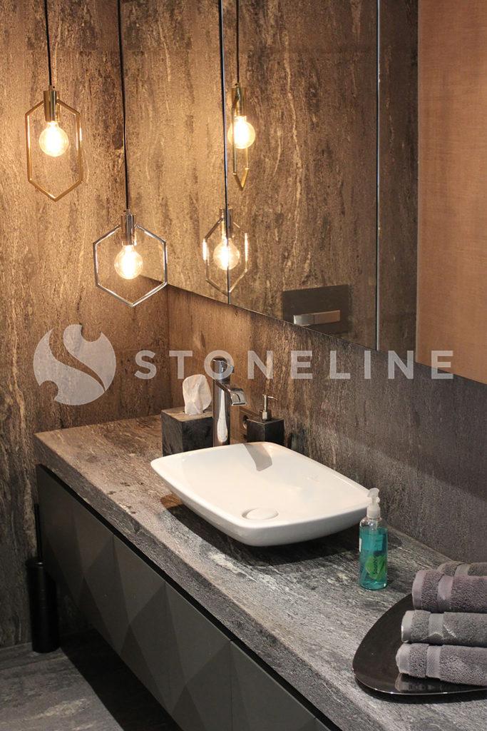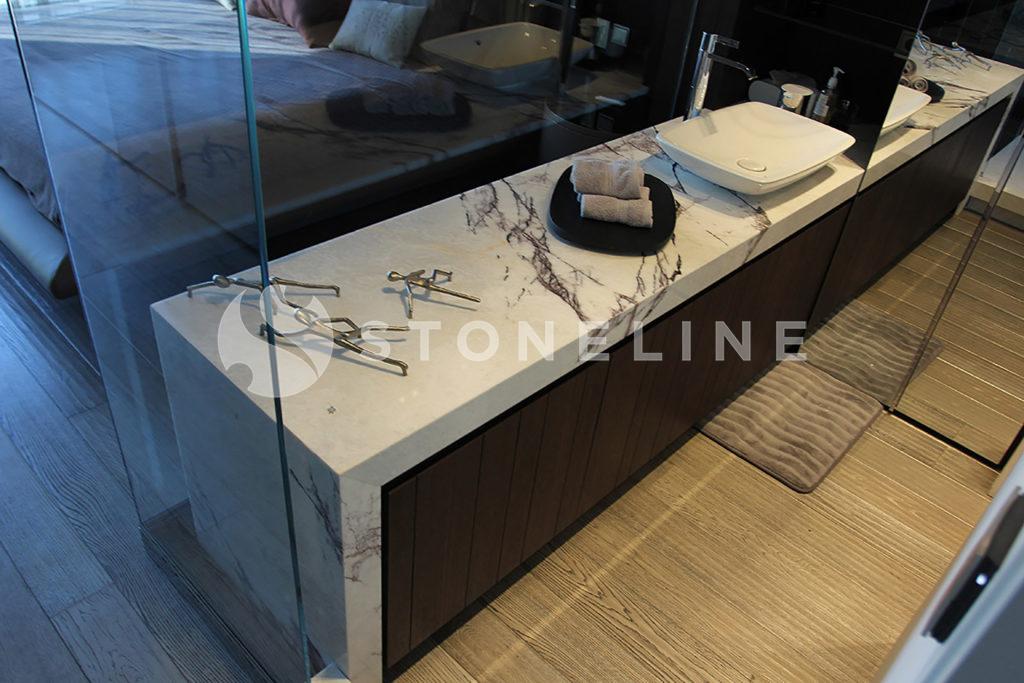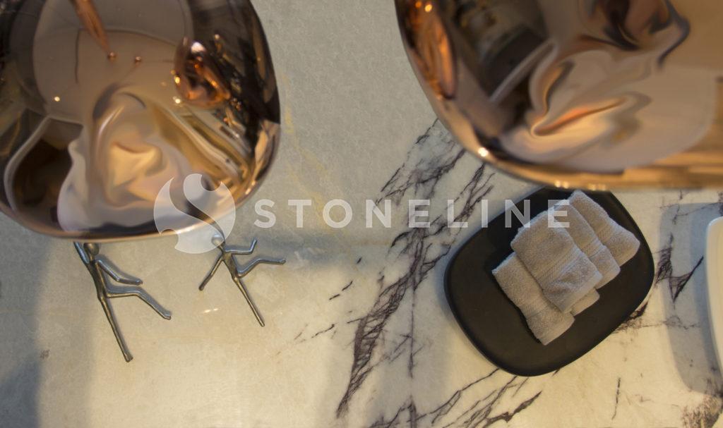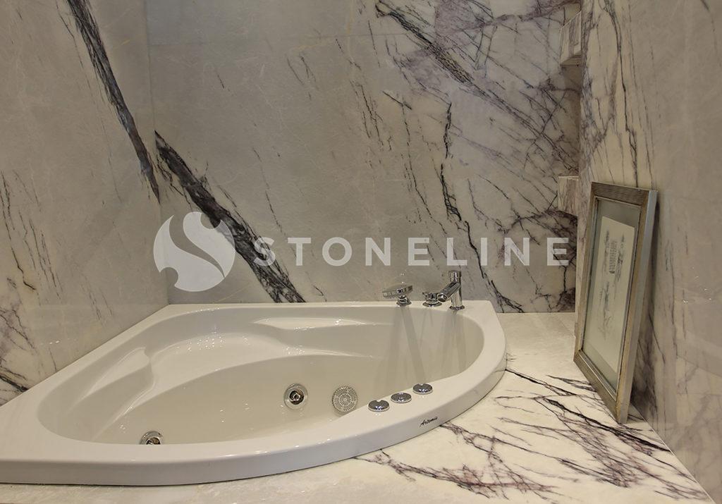 Designed by the Architect Canan Çakmak, this private residence project is decorated with Colorado Bronzo marble in floors while Lilac is preferred in bathroom with the unique harmony of purple and white.