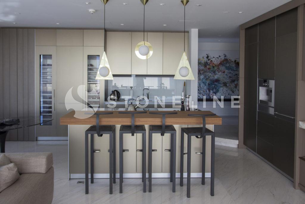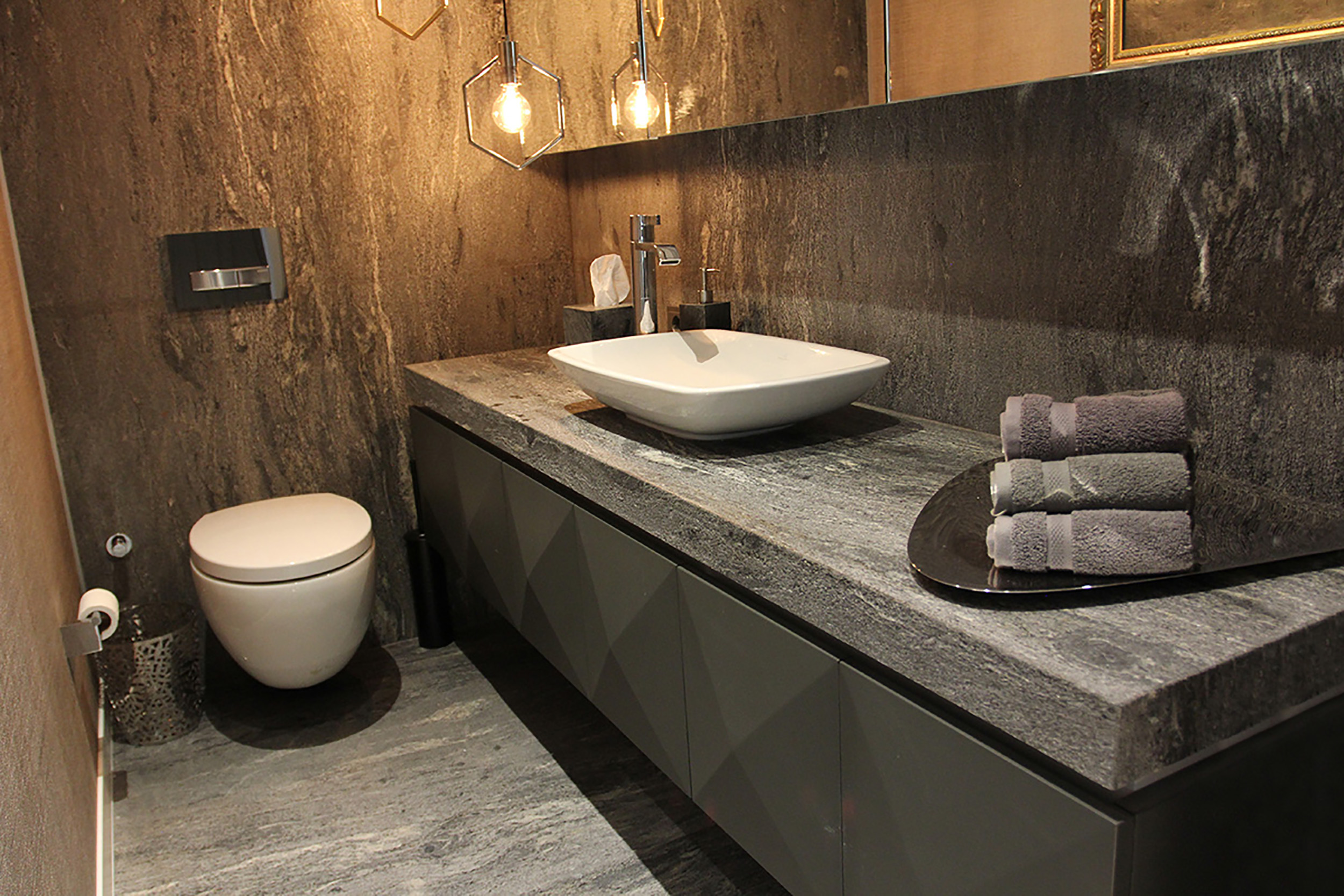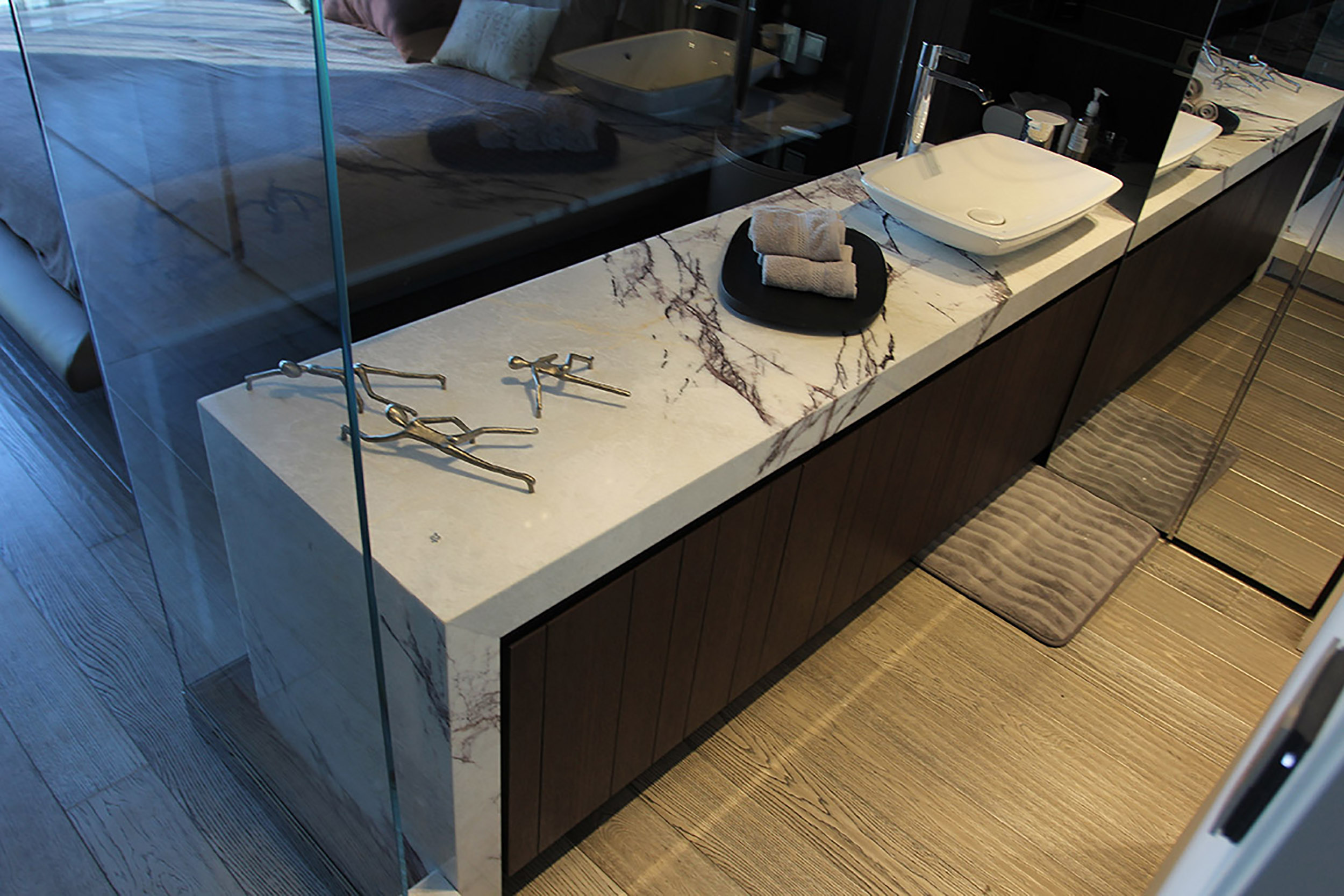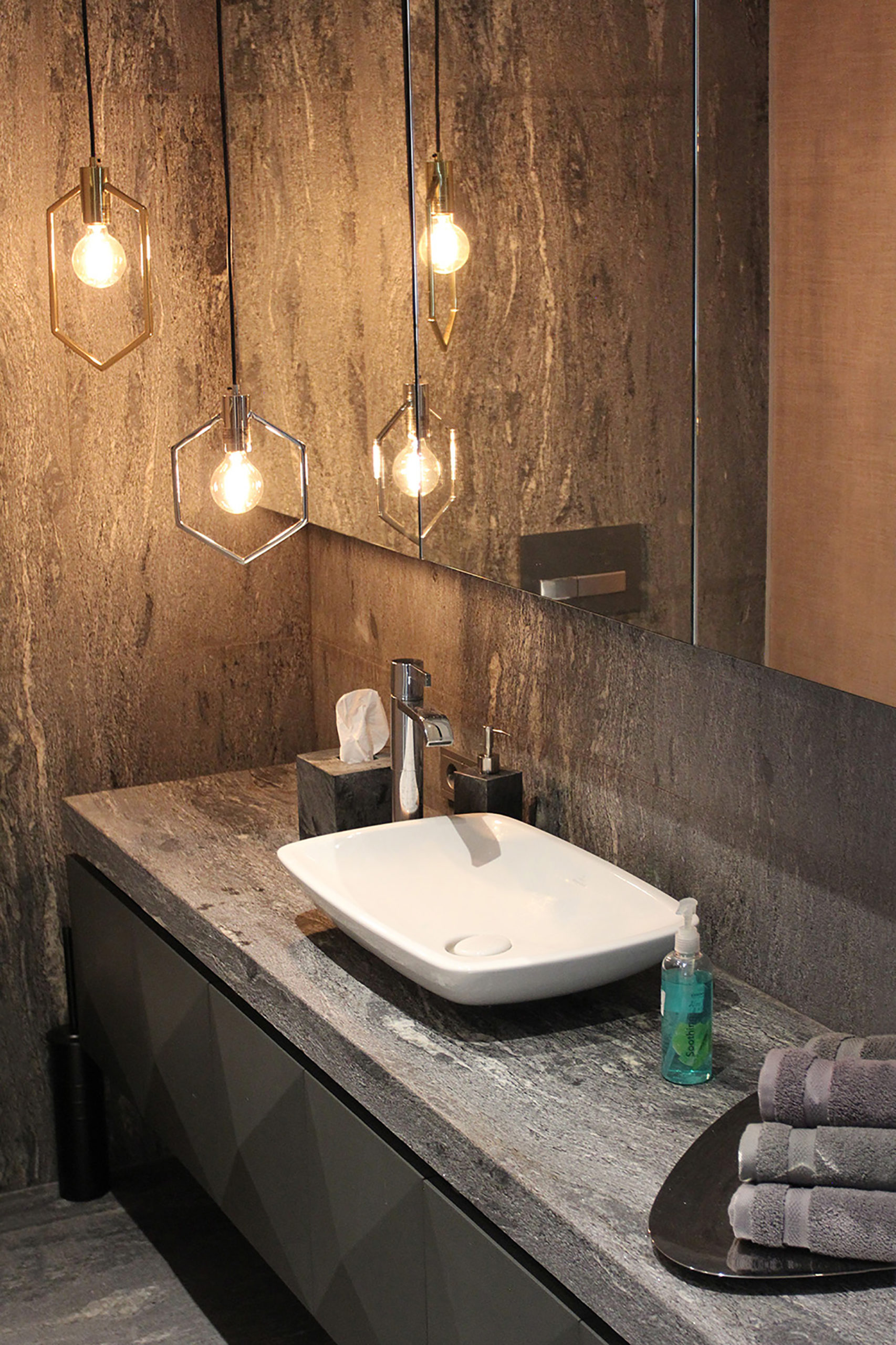 Designed by the Architect Canan Çakmak, this private residence project is decorated with Colorado Bronzo marble in floors while Lilac is preferred in bathroom with the unique harmony of purple and white.