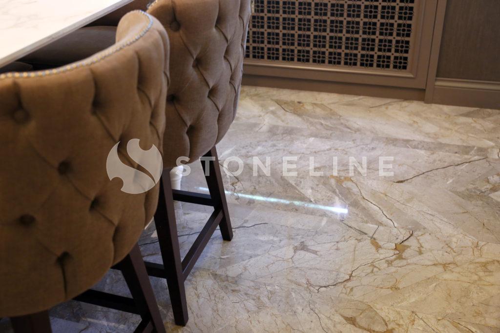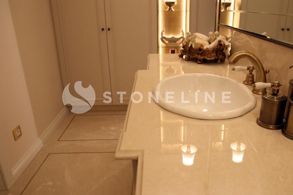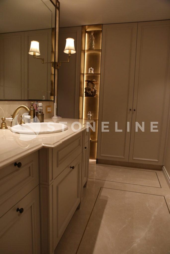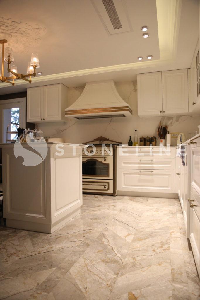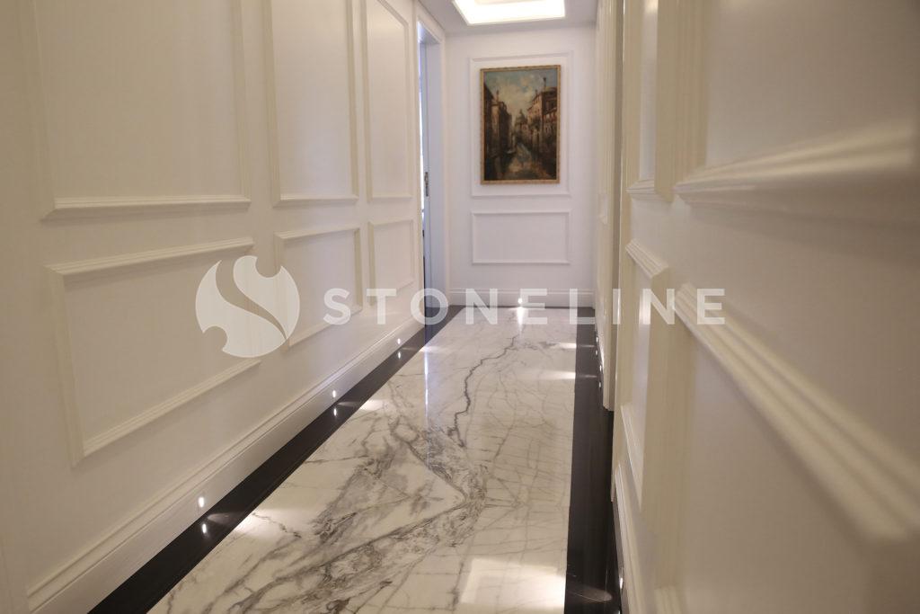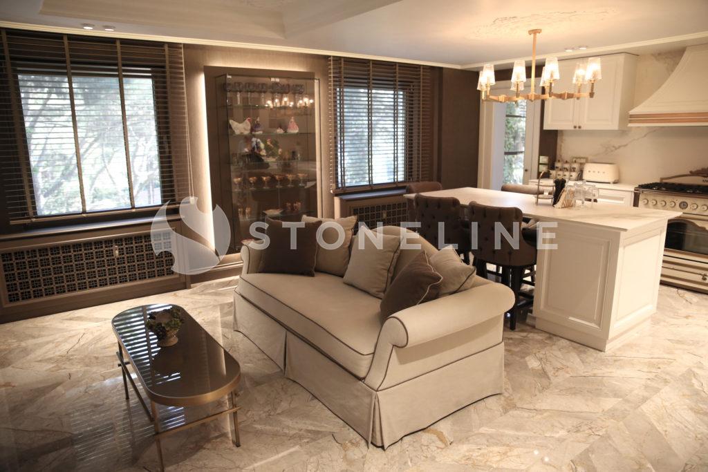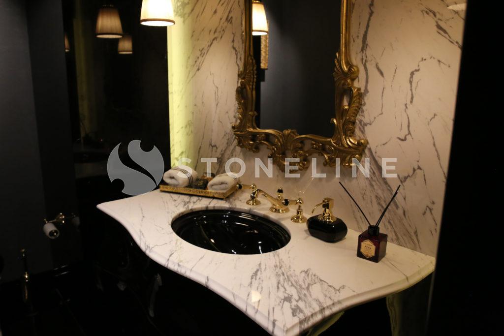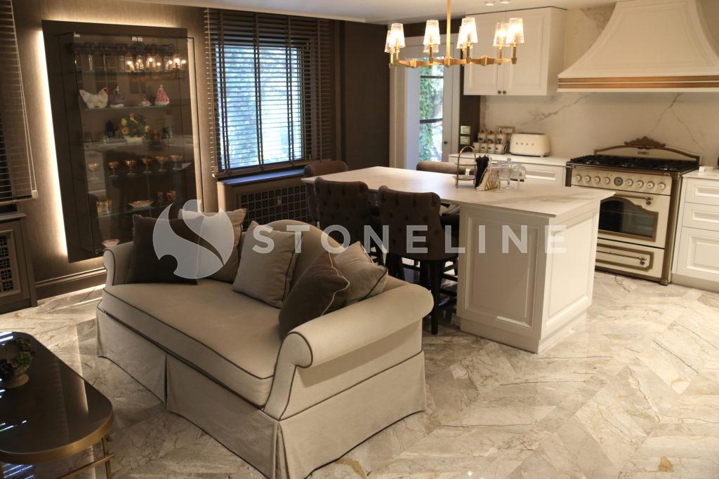 The hallway of this private residence project by Rıfat Baltaoğlu is covered with Calacatta Aria that is very suitable for bookmatch while it is surrounded by King Black. Grey Vision comes to life in the kitchen with its harmony of colors and supreme vein texture. In the bathroom, designers chose King Black and Bianco Statuario Altissimo. You can also discover hundreds of stones from the natural stone selection of Stoneline for your elegant designs.