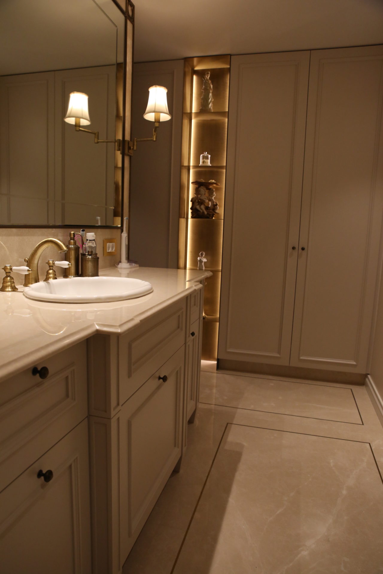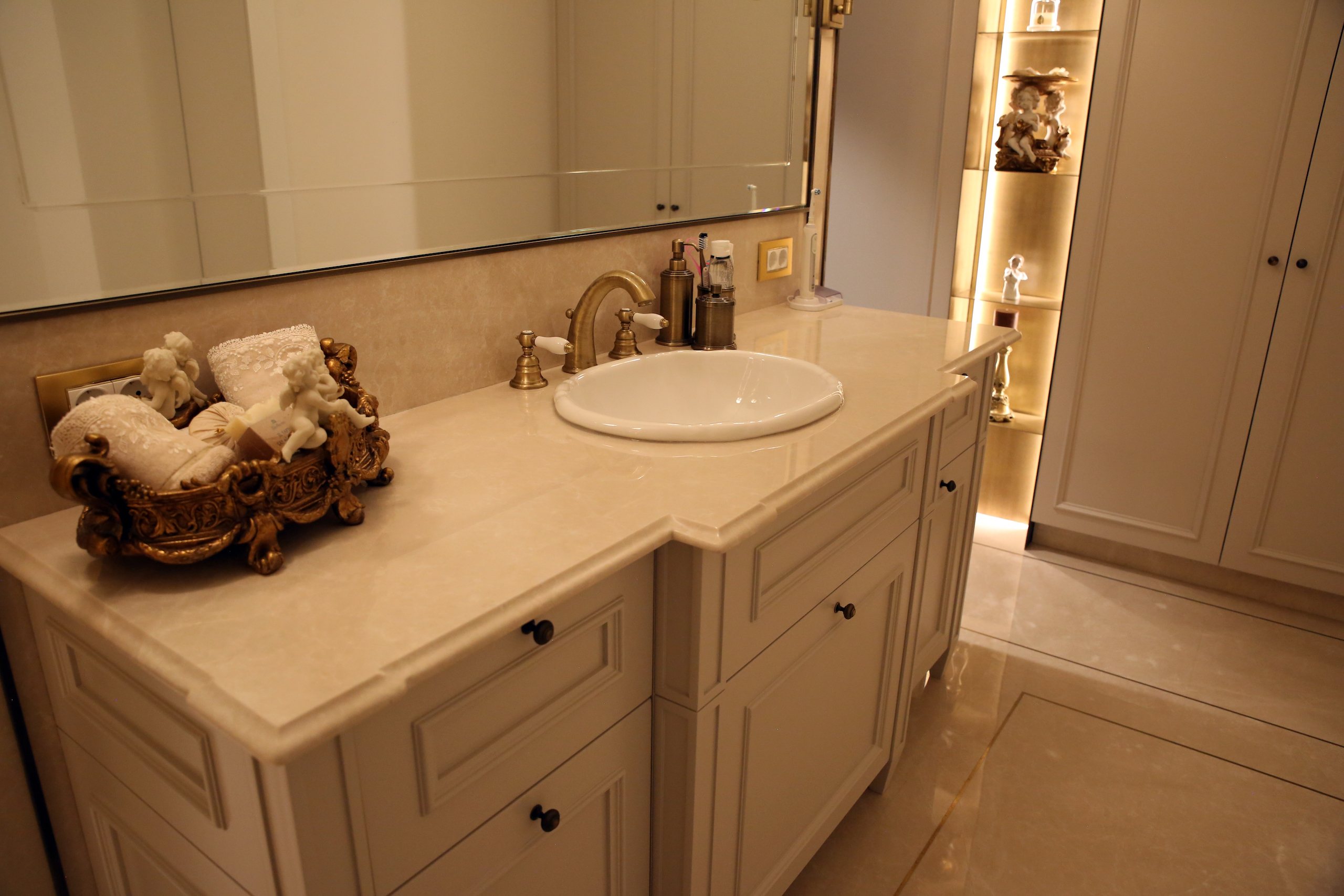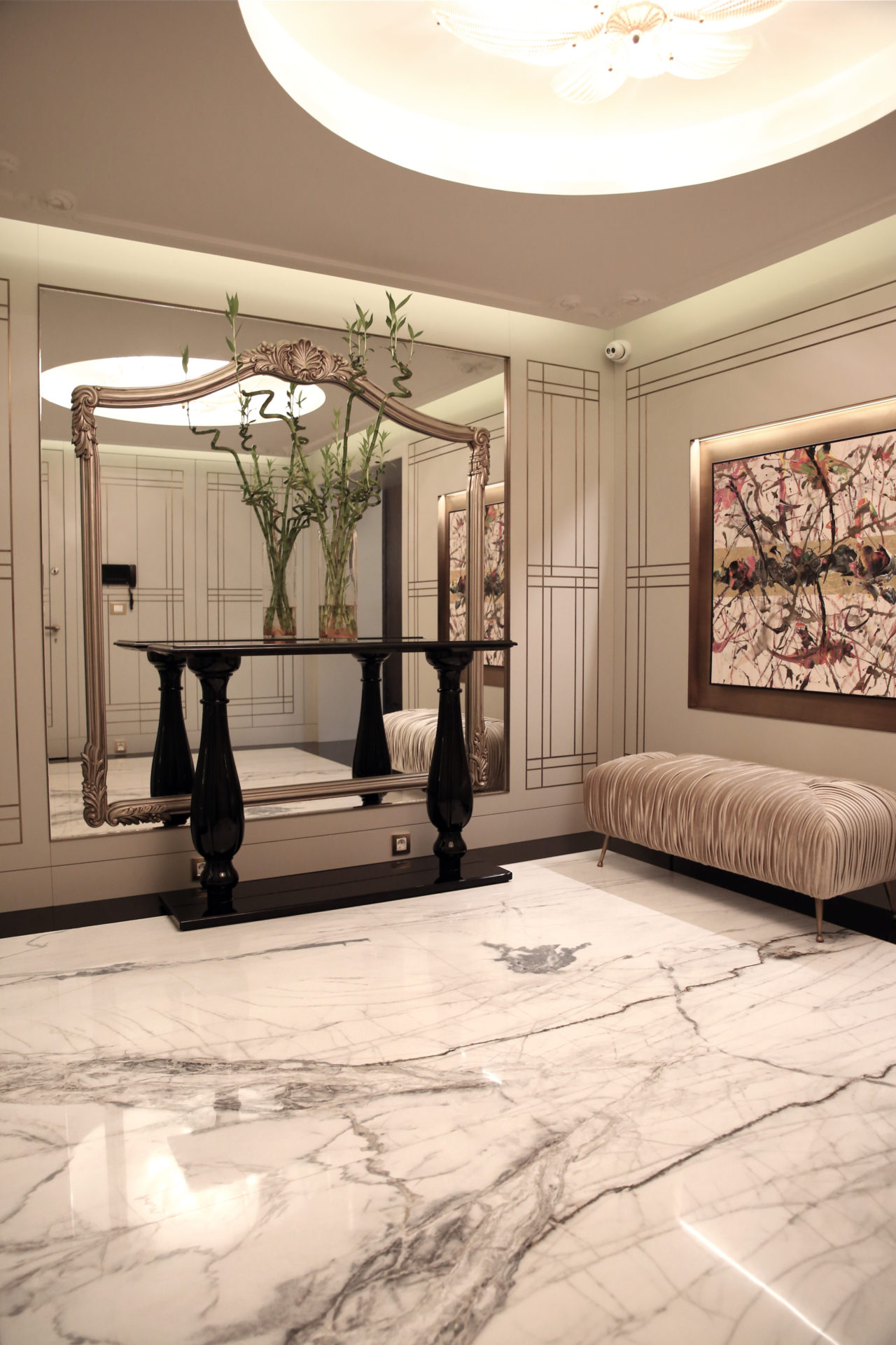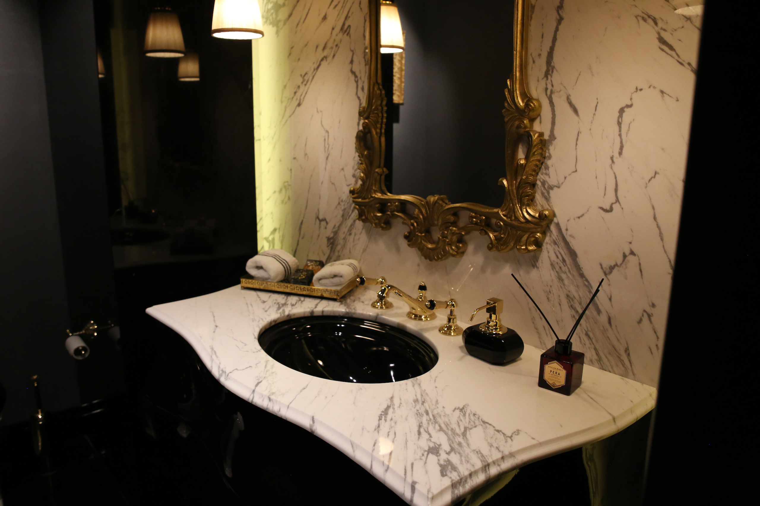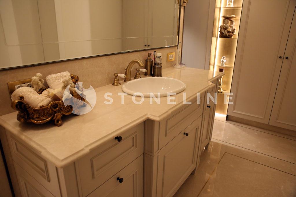The hallway of this private residence project by Rıfat Baltaoğlu is covered with Calacatta Aria that is very suitable for bookmatch while it is surrounded by King Black. Grey Vision comes to life in the kitchen with its harmony of colors and supreme vein texture. In the bathroom, designers chose King Black and Bianco Statuario Altissimo. You can also discover hundreds of stones from the natural stone selection of Stoneline for your elegant designs.