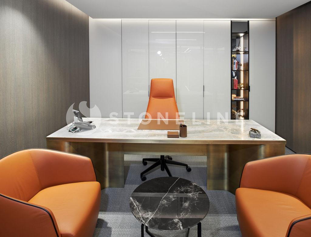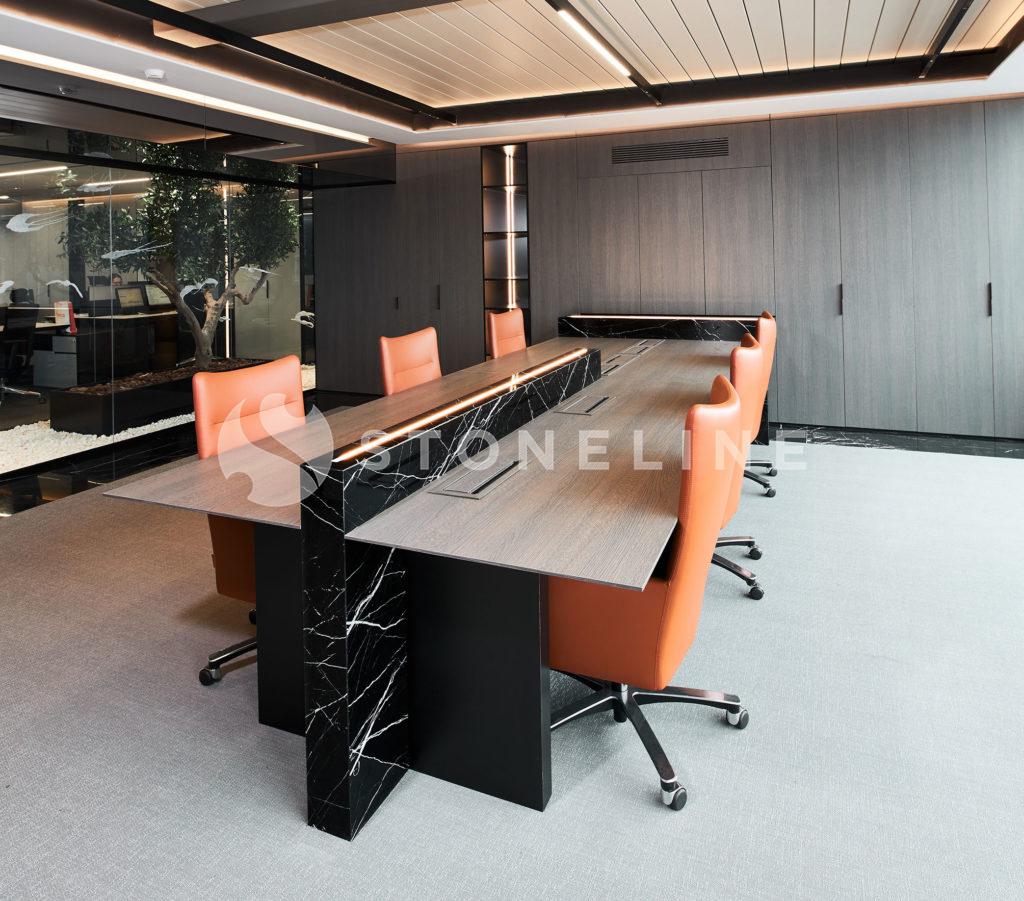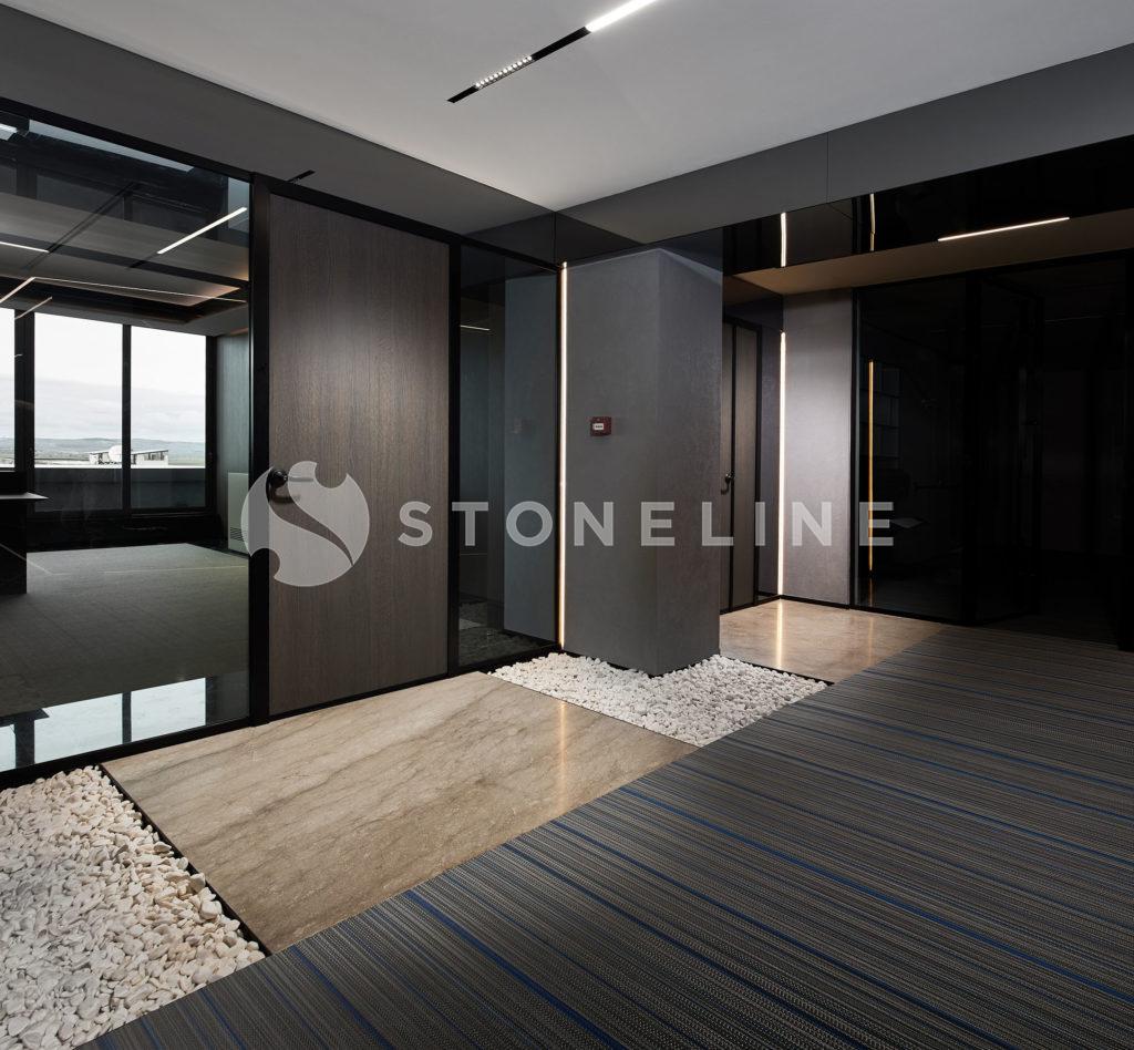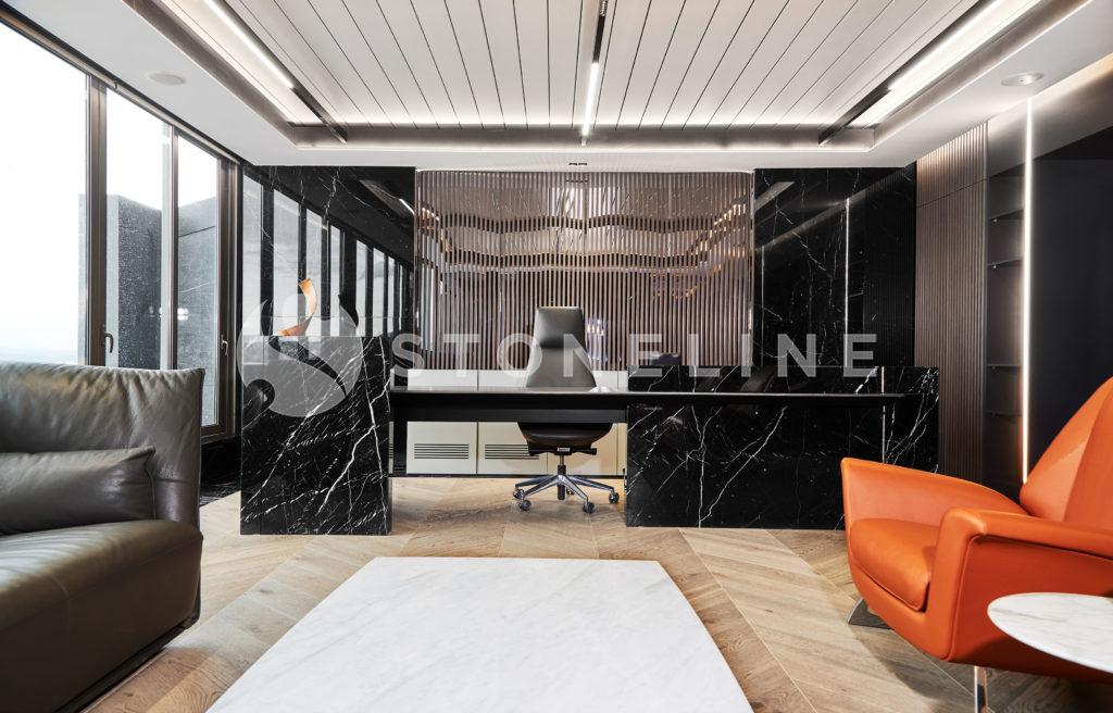 Designed by Team Proje, this office is fine tuned to a minimalist approach. The soft lines and contrasting colors make Volacas Extra and King Black the lead actors of this unique project. You can make use of Stoneline’s natural stone collection in your fireplace designs.