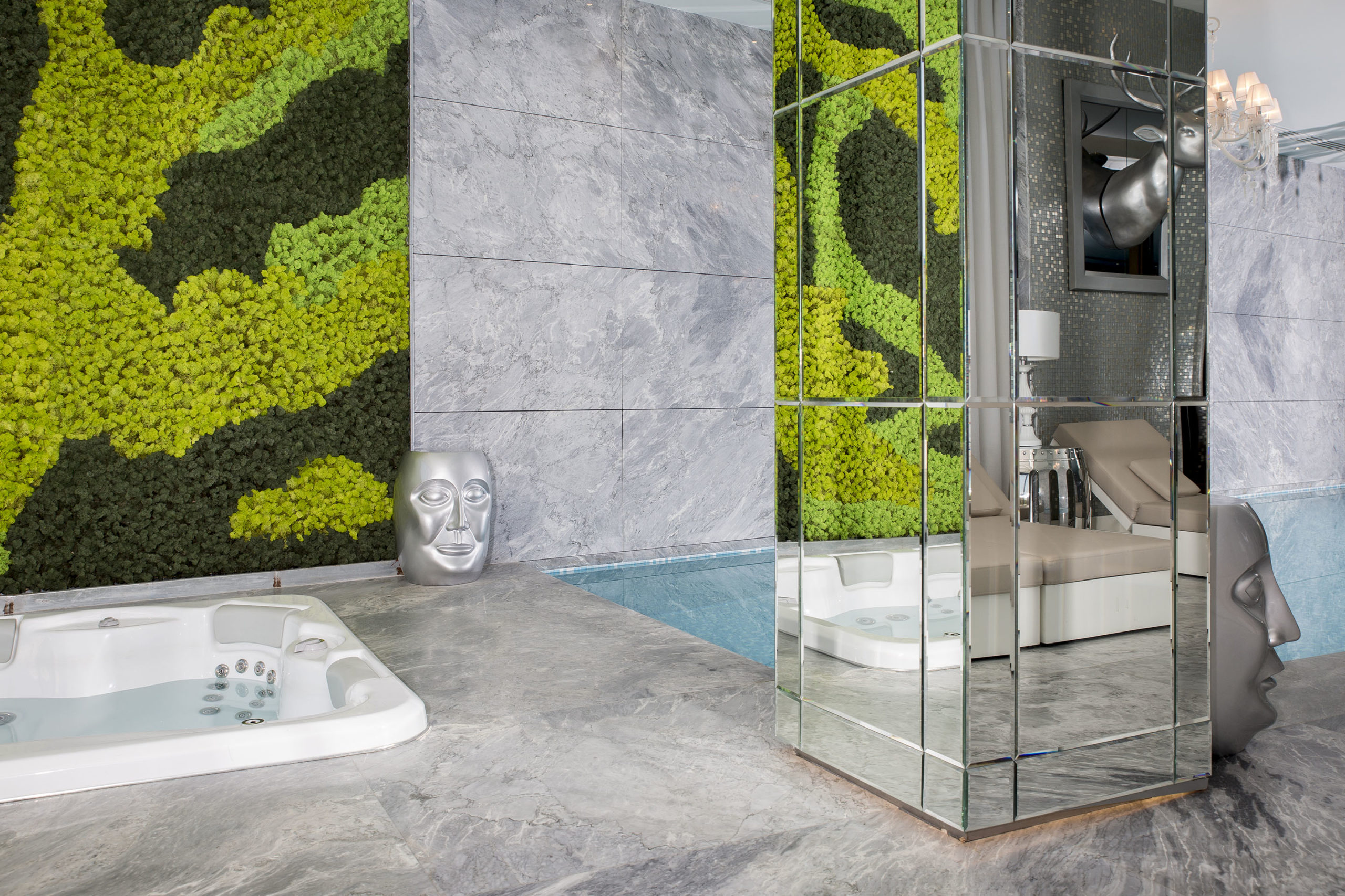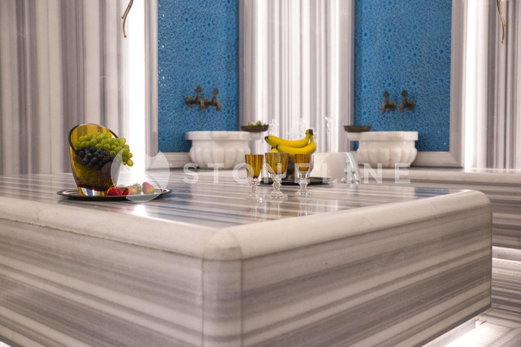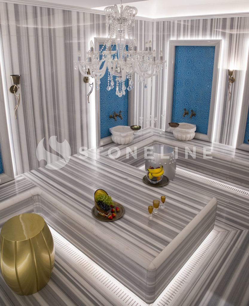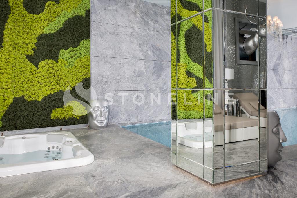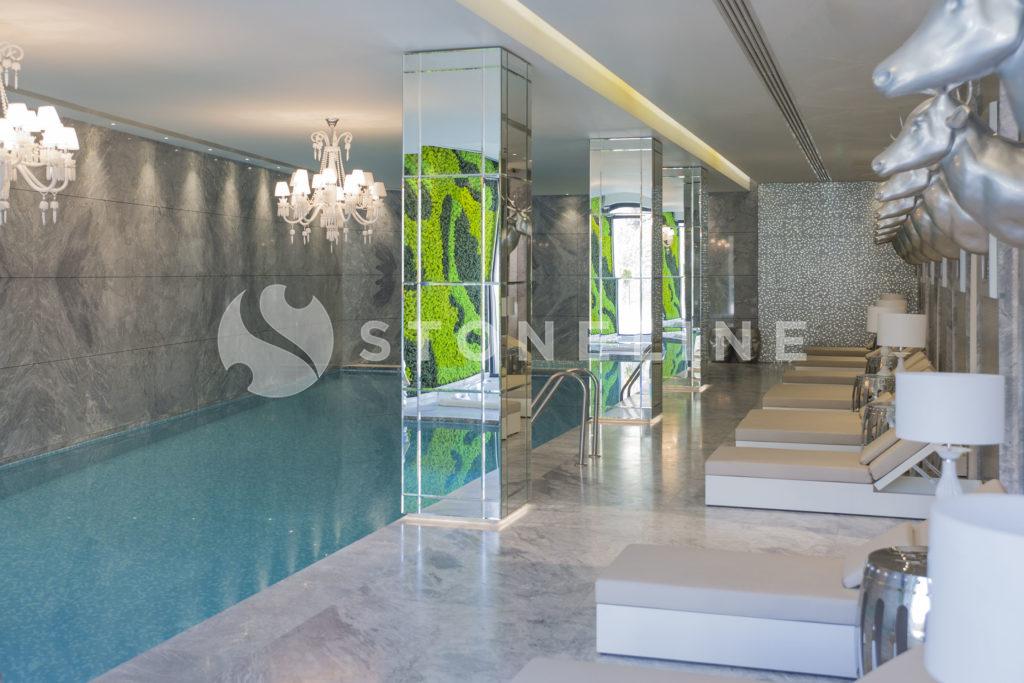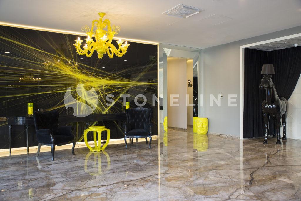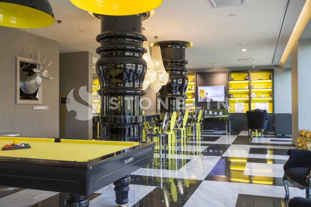 There are various selections from Stoneline’s natural stone collection in this special project with a breathtaking view decorated with a unique interior design by Starck. Interiors are decorated with Grey Vision and Bianco Fantastico while social areas are covered with Versalys that features different shades from blue to grey as well as Black & White granite that is the noblest form of black and white. Wet areas are decorated with Marmara Stripes that is the first choice in Turkish Bath designs.